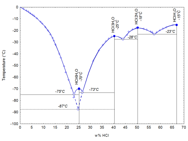 如下圖所示,鹽酸共有四個(gè)結(jié)晶的共熔點(diǎn),分別對應(yīng)四種晶體:68%(HCl的質(zhì)量分?jǐn)?shù),下同)時(shí)的HCl·H2O、51%時(shí)的HCl·2H2O、41%時(shí)的HCl·3H2O和25%時(shí)的HCl·6H2O。另外在24.8%時(shí)還有一種亞穩(wěn)的HCl·3H2O生成。