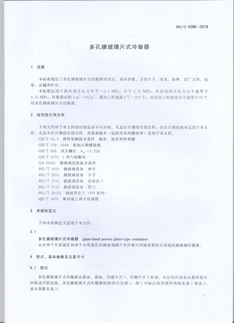 本標(biāo)準(zhǔn)適用于器內(nèi)設(shè)計壓力大于-0.1MPa、小于0.25MPa ,夾層內(nèi)設(shè)計壓力小于或等于0.35MPa ,冷凝器面積3㎡~ 60㎡,器內(nèi)工作溫度0℃~200℃ ,夾層內(nèi)工作溫度小于或等于95℃的多孔搪玻璃片式冷凝器。