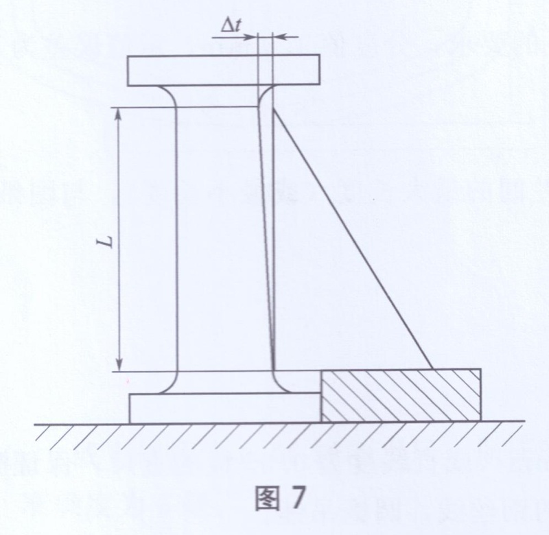 將被測(cè)塔節(jié)法蘭端放置在平臺(tái)上,在緊靠法蘭邊處墊放一平行度標(biāo)準(zhǔn)圓墊塊,用直角尺貼靠在塔節(jié)壁上(如圖7所示),繞塔節(jié)軸線旋轉(zhuǎn)平行度標(biāo)準(zhǔn)圓墊塊和直角尺,用直尺景取旋轉(zhuǎn)一周中塔節(jié)做體外壁與直角邊的最大距離△t,此值即為塔節(jié)法蘭對(duì)塔節(jié)的垂直度。