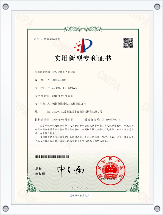 碳化硅換熱器內(nèi)測(cè)密封裝置專利證書