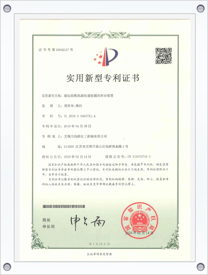 碳化硅換熱器雙側(cè)密封裝置專利證書