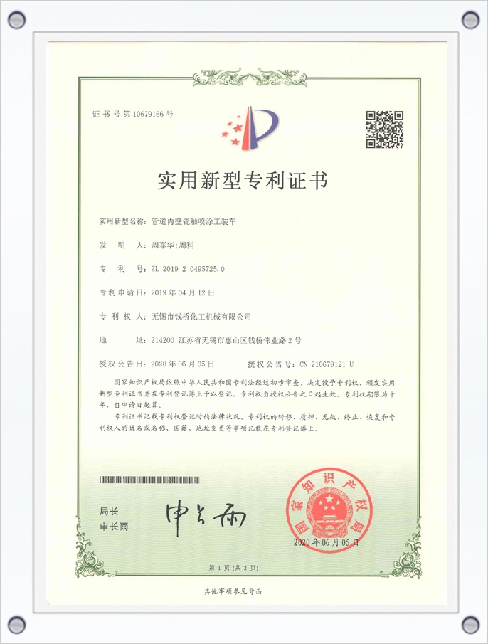管道內(nèi)壁瓷釉噴涂工裝車專利證書