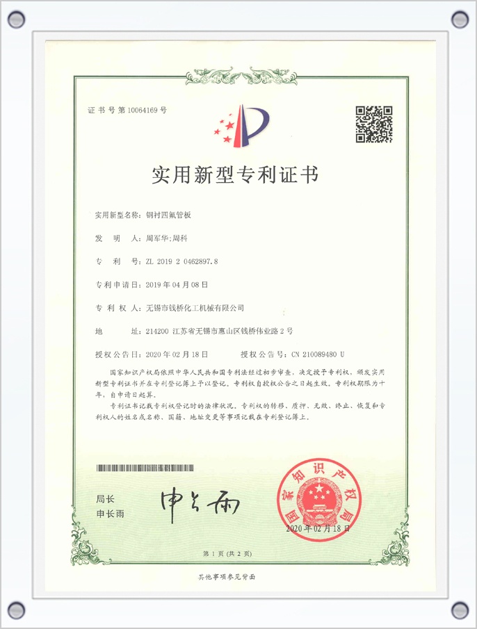 碳化硅換熱器鋼襯四氟管板密封裝置專利證書