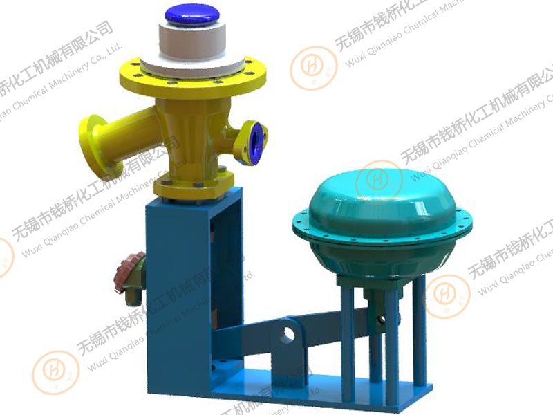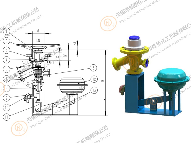 Bottom outlet valve (60°) gap free with pneumatic actuator(Side cylinder)搪玻璃上展式自動放料閥(側(cè)向執(zhí)行機構(gòu)) *內(nèi)置測溫氣動放料閥.The inorganic acid, organic acid, weak alkali solution and organic solvent are superior to stainless steel in strong corrosive media such as hydrochlor
